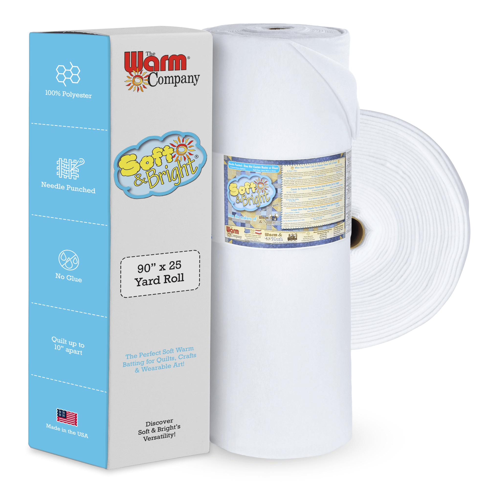 Soft & Bright undergoes the same manufacturing process that has made Warm & Natural, the world’s leading batting. Soft & Bright consists of premium grade polyester fibers, needle-punched into a strong paper thin base material that holds the fibers in place, keeping the batting even and consistent. The high quality polyester fiber is soft and fluffy to the touch. The evenly layered fibers of Soft & Bright will stay in place inside your quilt and Soft & Bright will keep its shape even after a lifetime of gentle washings. The thin base material holds the fiber in place preventing slipping making free motion quilting a breeze! Top and backing fabric will cling to Soft & Bright as it is fed through your machine, making basting spray a thing of the past. Soft & Bright can be quilted or tied up to 10″ apart so you can finish quilts even faster! Confidently use Soft & Bright in a hoop for embroidery and hand quilting without worry of distorting. Machine wash and dry finished quilts without any shrinkage. Soft & Bright is preferred for use in children’s quilts as they require more frequent washing and Soft & Bright quilts dry so quickly.