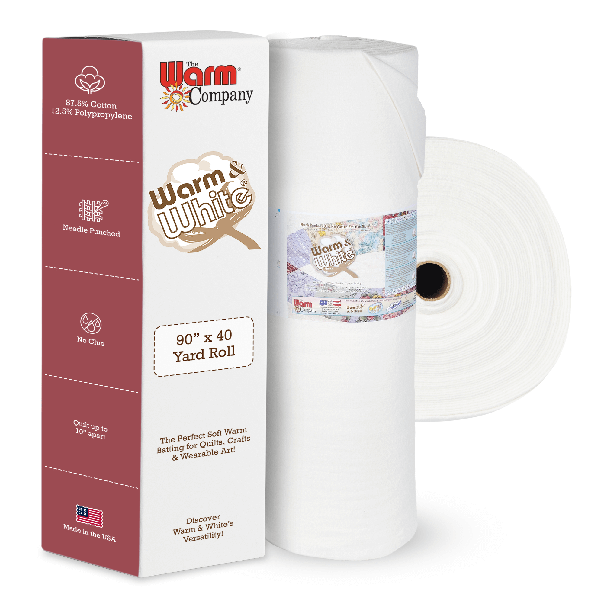 Warm & White is The Warm Company’s second highest selling quilt batting enjoying world-wide success for over 30 years. Warm & White is everything you love about Warm & Natural with beautiful white cotton fibers! It is made in the same state of the art needle-punched tradition that made Warm & Natural the most highly regarded quilt batting in the world. Warm & White is the ideal batting for use with bright whites, pastels, and tone-on-tone fabrics because Warm & White won’t peek through!